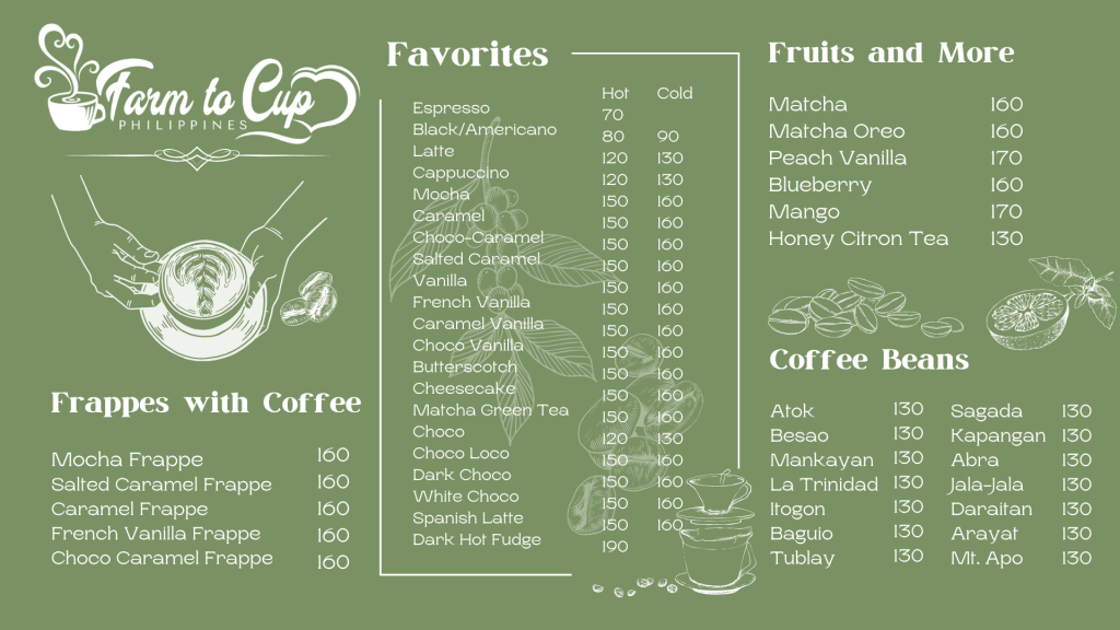 Here is the menu of Farm to Cup DIY Brew Bar as of 2024: